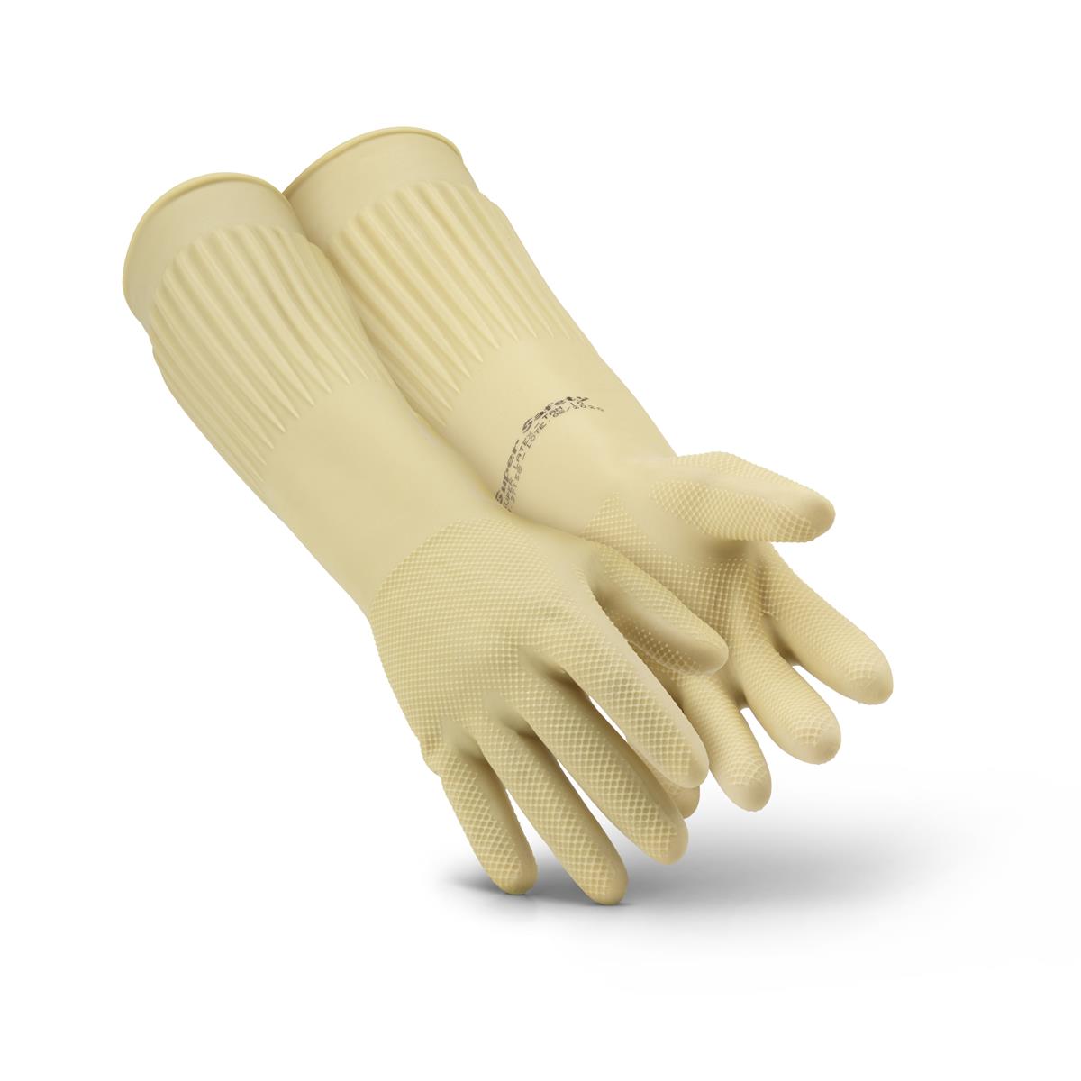 Luva de segurança confeccionada em látex, revestimento interno clorinado, antiderrapante tipo diamante na face palmar e pontas dos dedos, formato anatômico com comprimento de 42 cm.