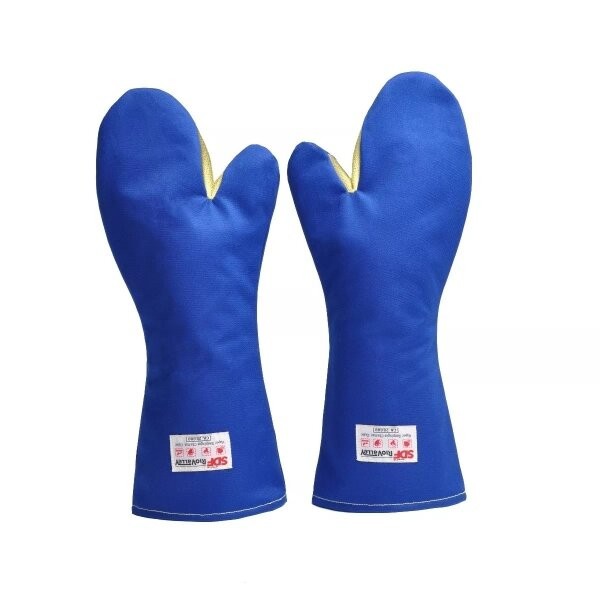 Luva de segurança 2 dedos Mão de Gato , Radiant Heat confeccionada em tecido de algodão com tratamento antichamas e respingos de Gordura Quente , impermeabilizada com silicione. Forração destacável, sendo uma camada em tecido e uma em não tecido, reforço entre polegar e indicador em aramida, costurada com linha de para-aramida.